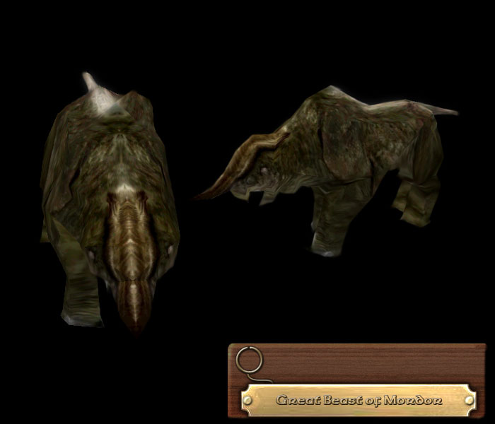 Believed to be partially related to or made in mockery of the fabled Kine of Araw that reside near the Sea of Rhun, the Great Beasts are massive, hulking beasts of burden that serve the forces of Mordor. Whether they were brought from the mysterious lands of the East or bred on the fertile plains of Nurn, the Great Beasts of Mordor are mainly tasked with transporting the greater siege weapons of Sauron, notably the battering ram Grond. Surprisingly passive when left on its own, a Great Beast can be agitated by the Orcs to become as destructive as a Mumak of Harad.