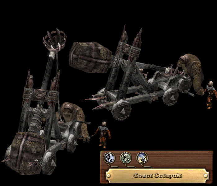 The Catapult of Mordor offers many choices of mayhem. Somewhat inferior to the Gondorian Trebuchets, these unlovely devices can hurl stones and flaming pitch far over or directly at enemy walls. When circumstances require it, the basket can be set with the decapitated heads of fallen enemy soldiers, ready to launch into the stronghold to demoralize its defenders.
