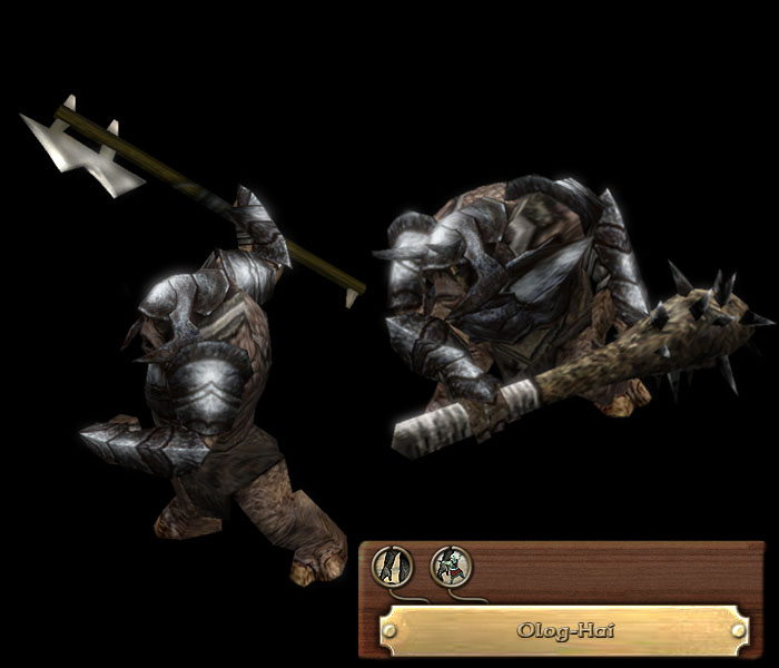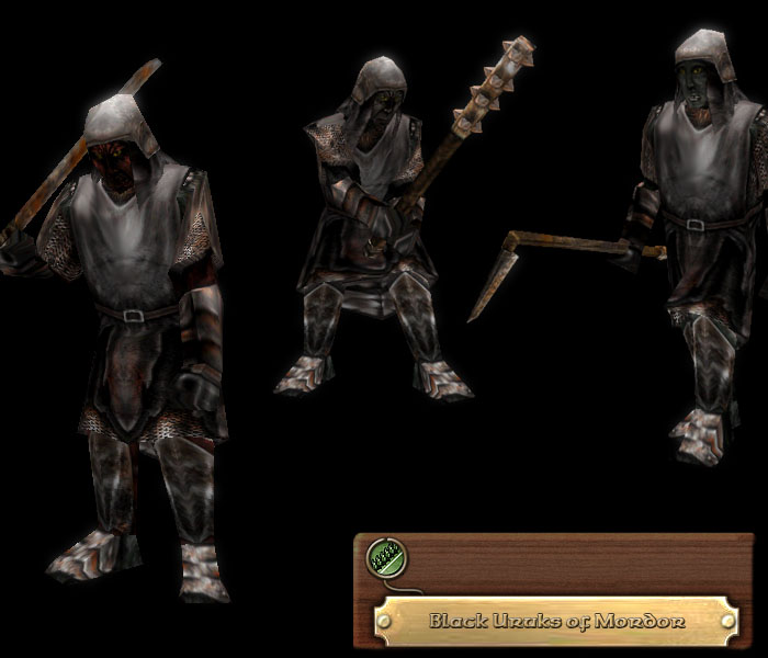 At a point late in the Third Age, a new breed of Orc made itself known, issuing from the strongholds of Sauron. The Uruk-hai, as they are known, are stronger, tougher and more resistant to sunlight than most Orcs, and fight with a ferocity unmatched by any. The Black Uruks of Mordor are the elite of the Orcish armies, wielding great weapons with great force, and wearing armour of a higher quality than the average Orc. Worse yet, some of these creatures are inducted to the ranks guarding the strong places of Mordor, and recieve better forged weapons and training to make them superbly suited to the role of Mordor's shock troops.