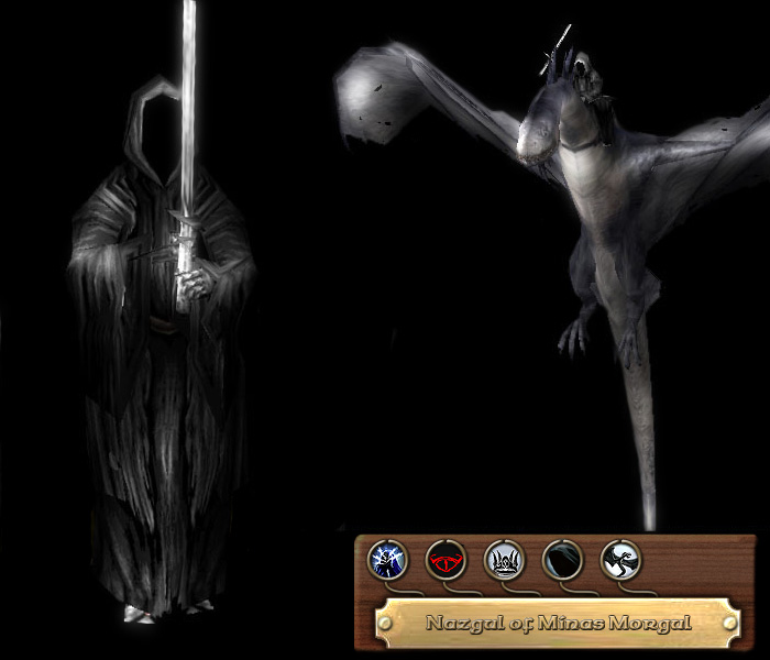 The nine Nazgul are the Dark Lord’s most powerful servants. Originally great lords of men, they were given the Nine Rings of Power and corrupted by Sauron’s influence, eventually succumbing to it and turned into the undead Ringwraiths. In the Third Age, the Nazgul were the chief agents of Shadow who organized the return of their Dark Lord, taking control of various realms such as Angmar, Dol Guldur, the various tribes of Rhun and after Angmar’s fall, Minas Morgul. The Ringwraiths were often found mounted in battle astride specially bred large black steeds. Invisible to mortal eyes, the Nine are only given form by their black garbs. They were ever capable of sensing the One Ring and were the very ones sent out to hunt for the Ring-bearer throughout Middle-earth. They have many weapons, ranging from steel longswords to cursed daggers to maces of fell strength. But they are not confined by physical weapons alone. They are surrounded by a perpetual aura of dread which drives away all but the bravest creature; their Black Breath is highly venomous and their deafening shrieks cause terror and despair. The Ringwraith’s prime weapon: fear however, is further strengthened by the coming of night and darkness.