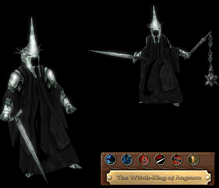 Tallest of the Nazgul and immune to their fear of fire and water, the Witch-king of Angmar ranks as Mordor’s most powerful captain, second-only to the Dark Lord himself. When in times of war, the Witch-king dons his battle armour and fights with a sword and a gigantic flail. Mounted atop a large black horse or fellbeast, the mere presence of the Nazgul-lord causes fear and panic on all his enemies on the field. A man who dares challenge the Witch-king is bold indeed, for the Nazgul may draw a Morgul-blade to incapacitate a particularly hated foe. So powerful is he that not even gates can abide his coming and the will of Mordor. The upraised blazing sword of the Witch-king that signifies the approaching hour of doom is an awe-inspiring sight indeed, for it renders the abilities and powers of all nearby heroes of the Free Peoples null.