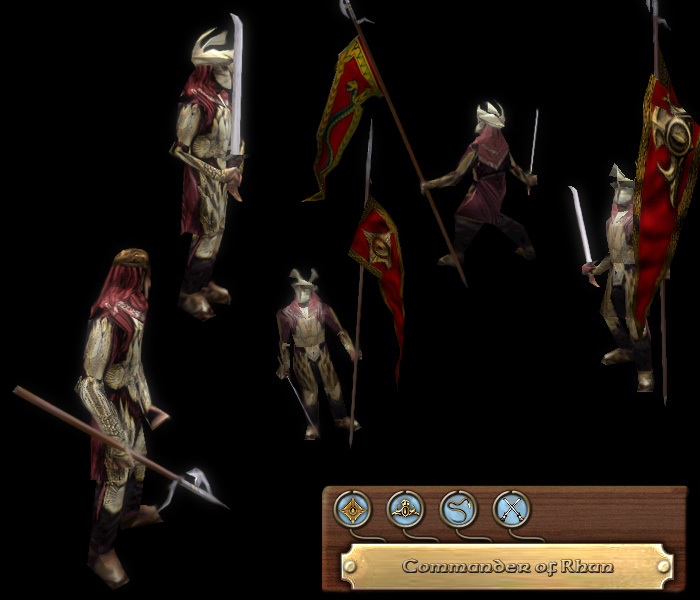 In preparation for the War of the Ring, Sauron had sent messengers and emissaries to both the East and the South, in the hope that the Easterlings and Haradrim may be ensnared to fight against the West. The Dark Lord had achieved his goal, for not only did the Men of Harad and Rhûn aided Mordor by sending large contingents of warriors and supplies, a multitude of their strongest leaders and champions entered the service of the Lidless Eye. In response to the summons, the princes, kings and rulers of the various tribes and realms of the East flocked under Sauron’s banner, encompassing all groups of warriors from weak clans of savages to empires powerful enough to challenge Gondor directly. The Chieftains of Rhûn are mighty and staunch fighters and leaders, surpassing all but the finest that Mordor has to offer. To slay an Easterling chief is a formidable task, for they are often completely engirdled by their most seasoned of bodyguards. When controlling a Chieftain of Rhûn, one has the option of attaching any of the three kinds of banners to his entourage, which are the standards of the East, Serpent and the Eye.